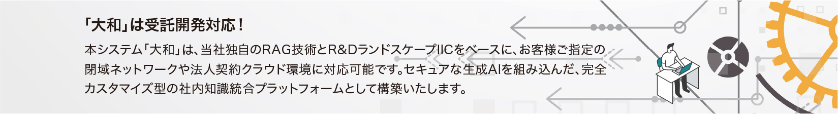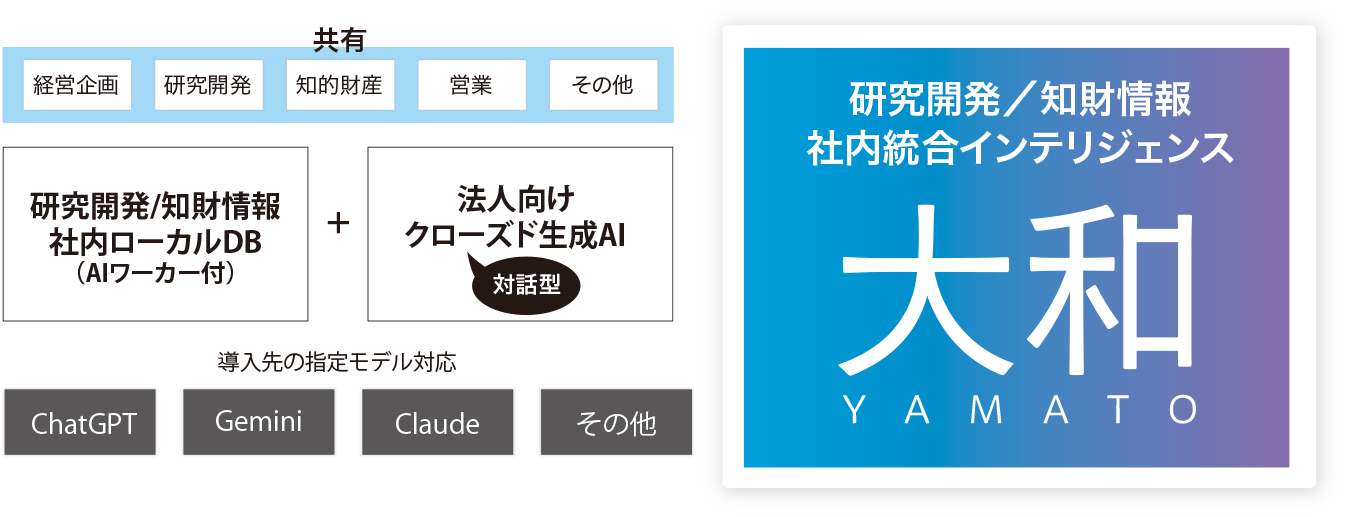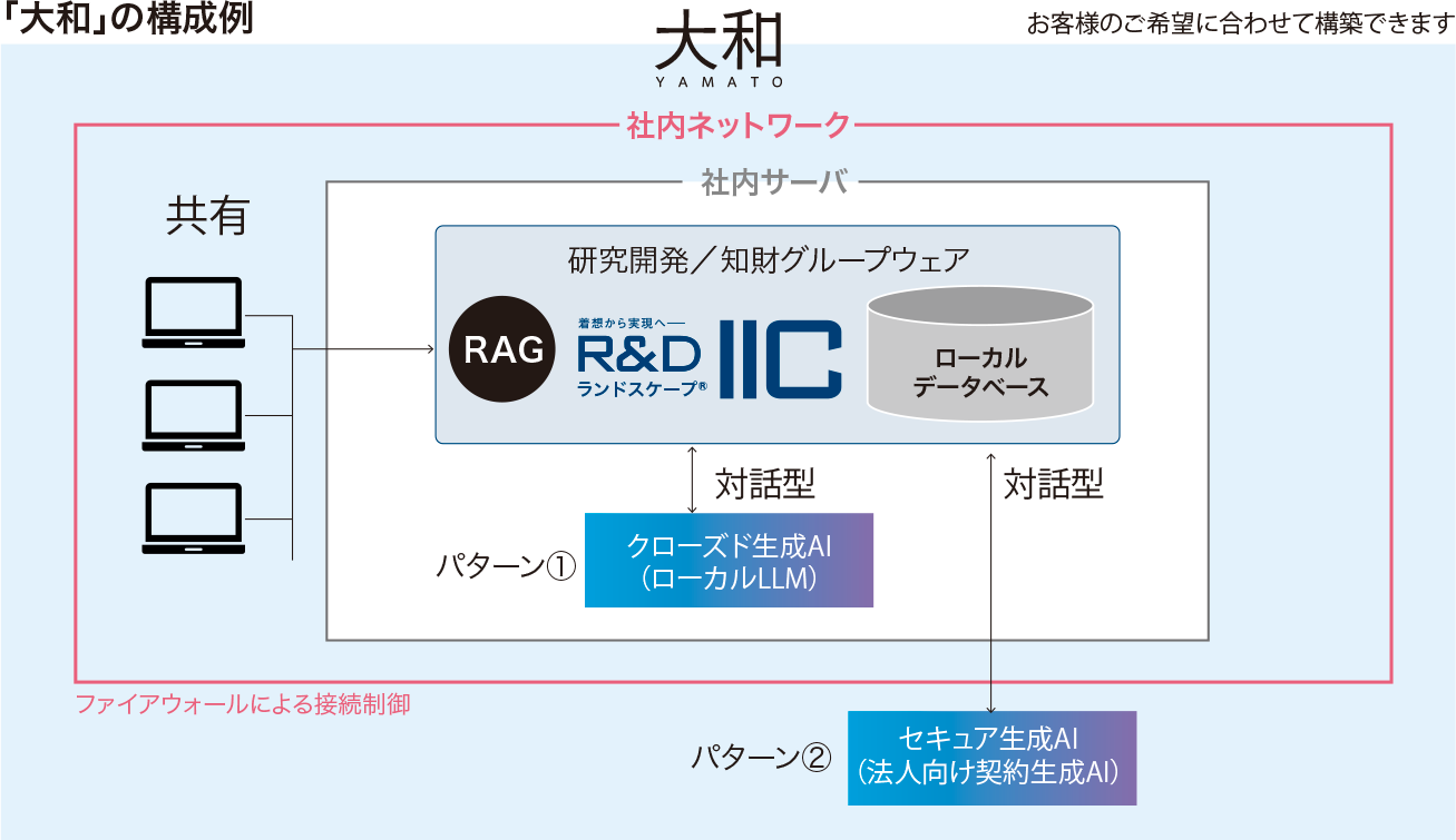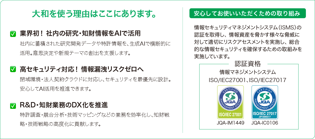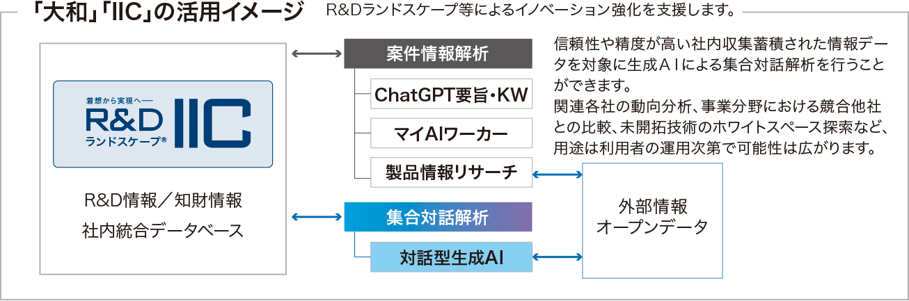 「大和」は、企業内に散在している研究開発情報や知的財産情報を統合・可視化し、生成AIを活用してイノベーションを加速させるインテリジェンス・システムです。「R&DランドスケープIIC」と、安全性の高い推論型生成AIを組み合わせることで、社内の知識資産を最大限に活用できます。